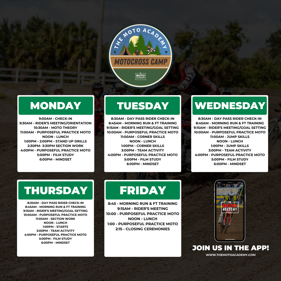 Check out the schedule for the week and what you can exppect from your Moto Academy Summer Camp experience!