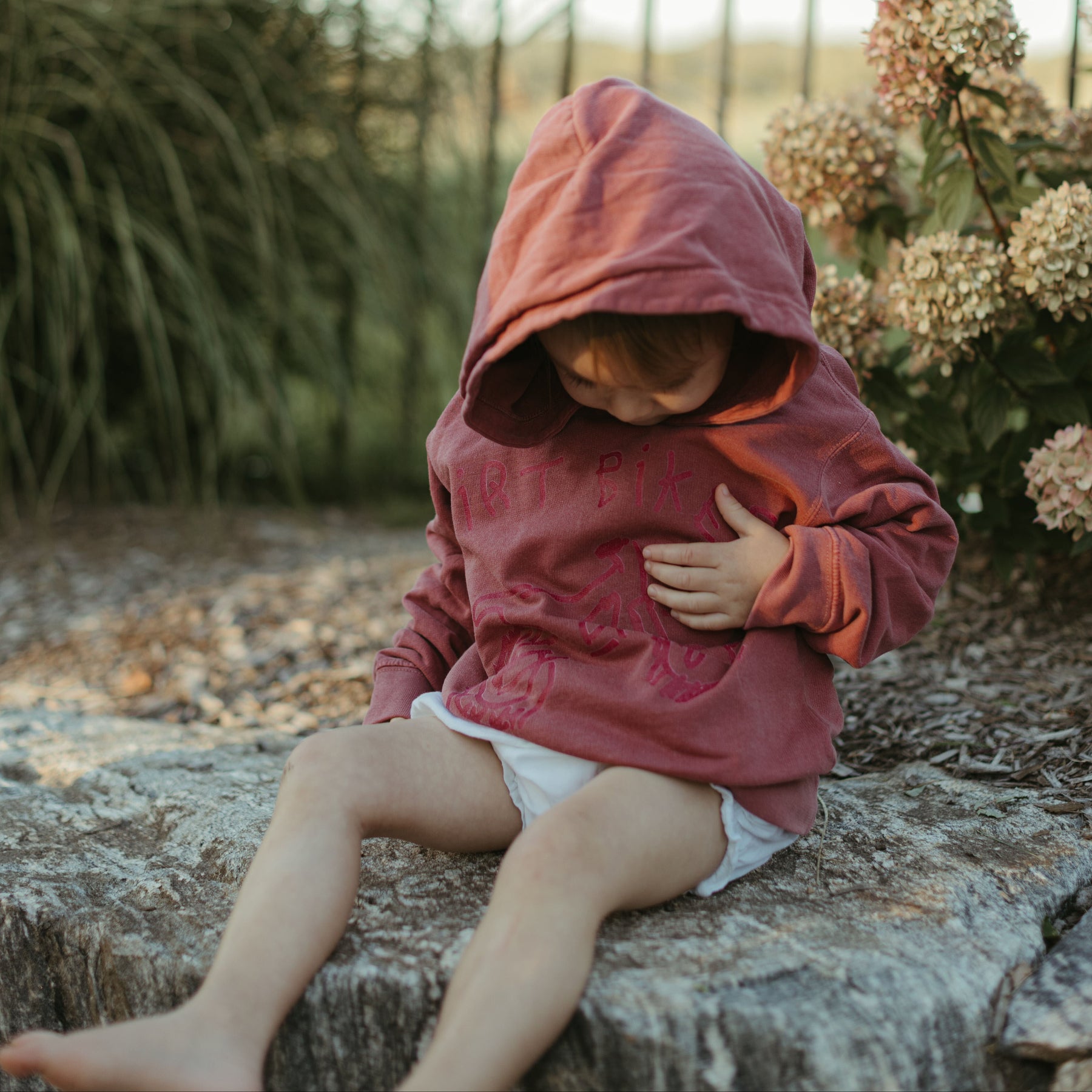 Child wearing a red hoodie sitting on a stone surface with flowers in the background