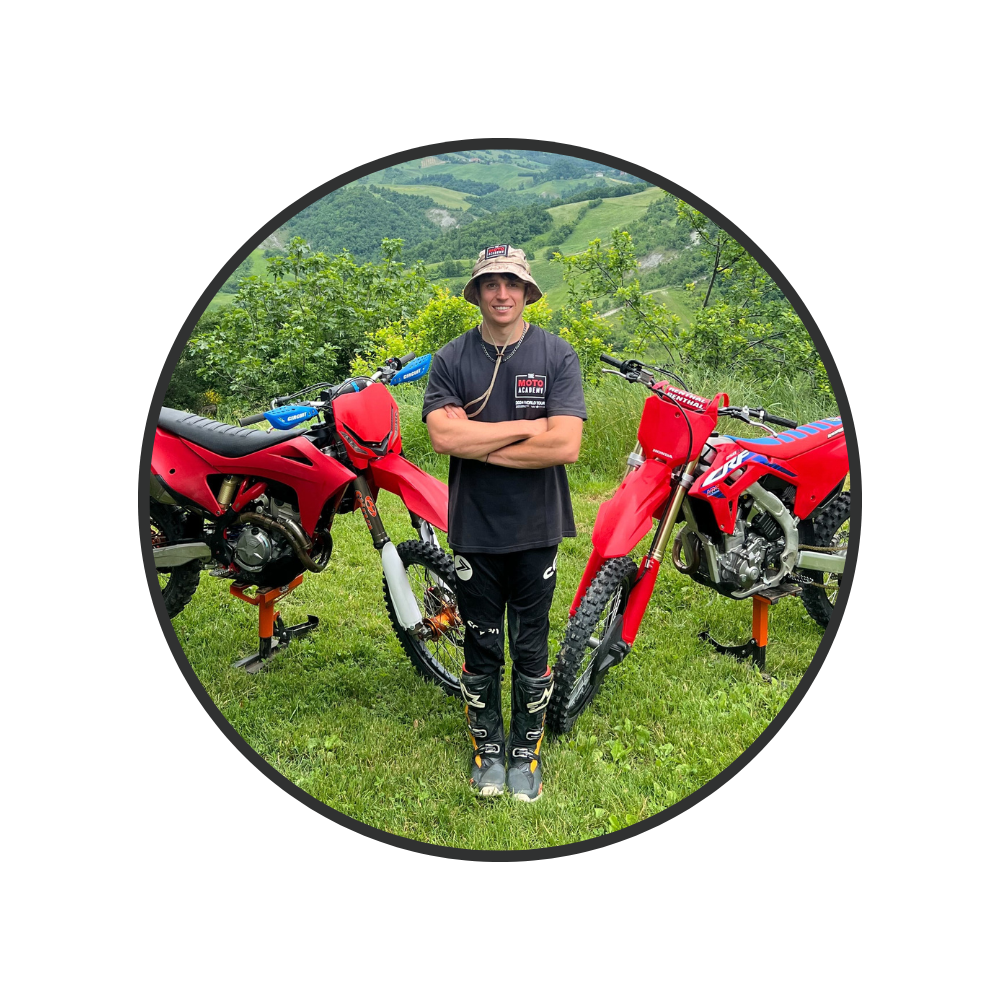 My motocross journey started at the age of four, when my father asked me if I wanted to keep playing soccer or ride a dirt bike. From that moment on, motocross became my passion. At 14, I decided to fully commit to dirtbikes, switching to enduro, where I raced in the Italian championships and had the great satisfaction of completing the International Six Days Enduro (ISDE) in 2021.