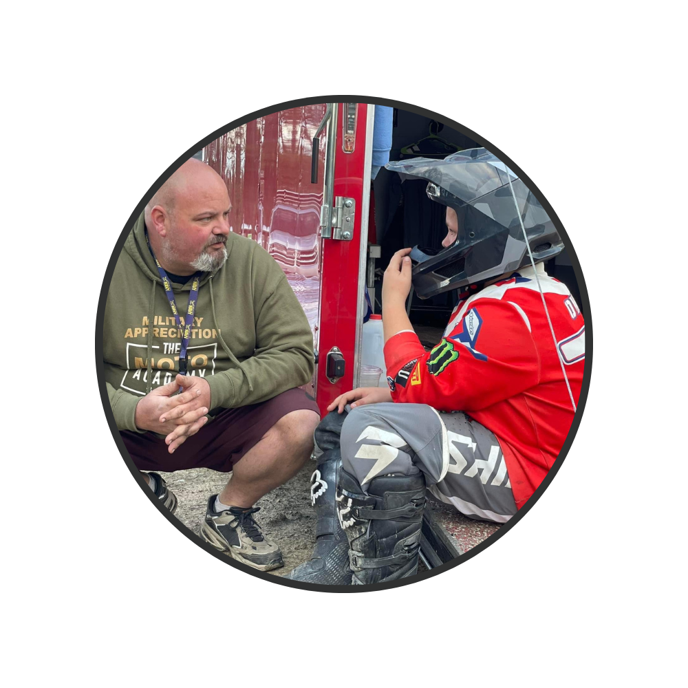 I started riding dirt bikes with my dad when I was 4 years old. I’ve loved all motorcycles and motorcycle history ever since I saw one. I rode and raced locally up until I was 16. I then started riding and eventually racing street bikes. My first was a cbr600rr. After high school I attended college where I played football and then off to the military in the United States Army. I served 10 year’s total and finished my last 5 as a helicopter mechanic. When finished with my military service I tested and became a professional firefighter for 21 years. All along this time I kept riding and racing. I retired from fire dept and was my son’s mechanic for his mx racing where I met AJ. I currently drive the race van, work on bikes, and anything else asked of me. My faith is very strong and gets me through life and teaches me to always be a blessing to others. I enjoy my family, golf, riding, beer, and this awesome community called The Moto Academy.